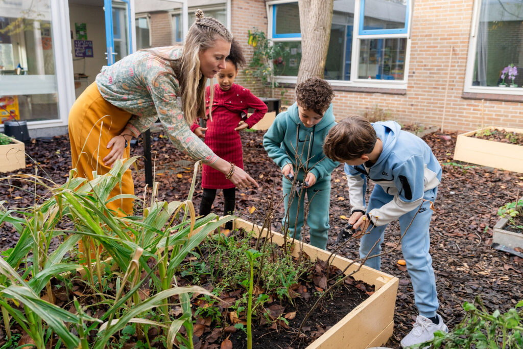 De schoolverlatersgroepen van De Vlindertuin werken ook in de schooltuin. Van april tot juni/juli worden hier groentes gezaaid, verzorgt en geoogst. Zelfs vanuit hun klaslokalen kunnen de leerlingen de groei nauwlettend in de gaten houden.